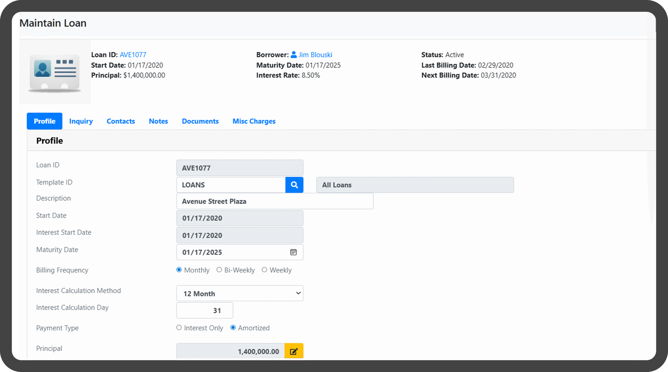 Manage every aspect of your loans through one comprehensive dashboard. View and edit key details including borrower information, payment terms, interest calculations, and billing schedules.